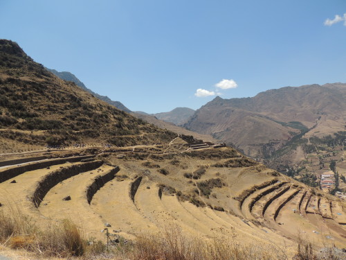 Moray is a group of deep, gigantic, bowl-like natural depressions in the earth in which concentric, circular stone terraces were carved into the landscape by the Inca. The series of circular platforms are deep and wide. They descend down to some 150 m (492 ft) and measure about the same in width. The terracing, a series of irrigation channels and the discovery of different seeds on the terraces have led scientists to believe that Moray was once an Inca crop lab. Many think the site was used by the Inca to cultivate resistant and hearty varieties of plants high in the Andes. The Incas planted wheat, quinoa, panti, kantu flowers (Cantua buxifolia, the Peruvian national flower), corn and some 4,000 varieties of potatoes at Moray and experimented with different elevations/altitudes, sunlight exposures and temperatures within the terraced depressions. Definitely one of the coolest agricultural labs I've ever seen.
